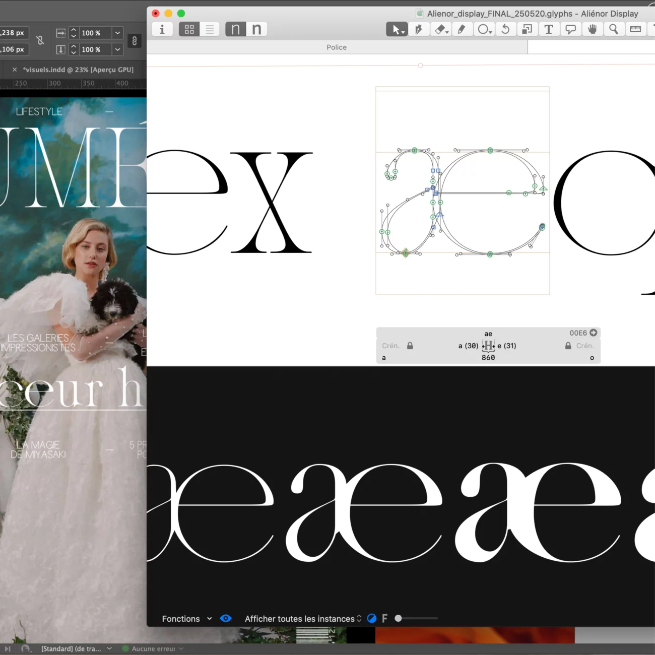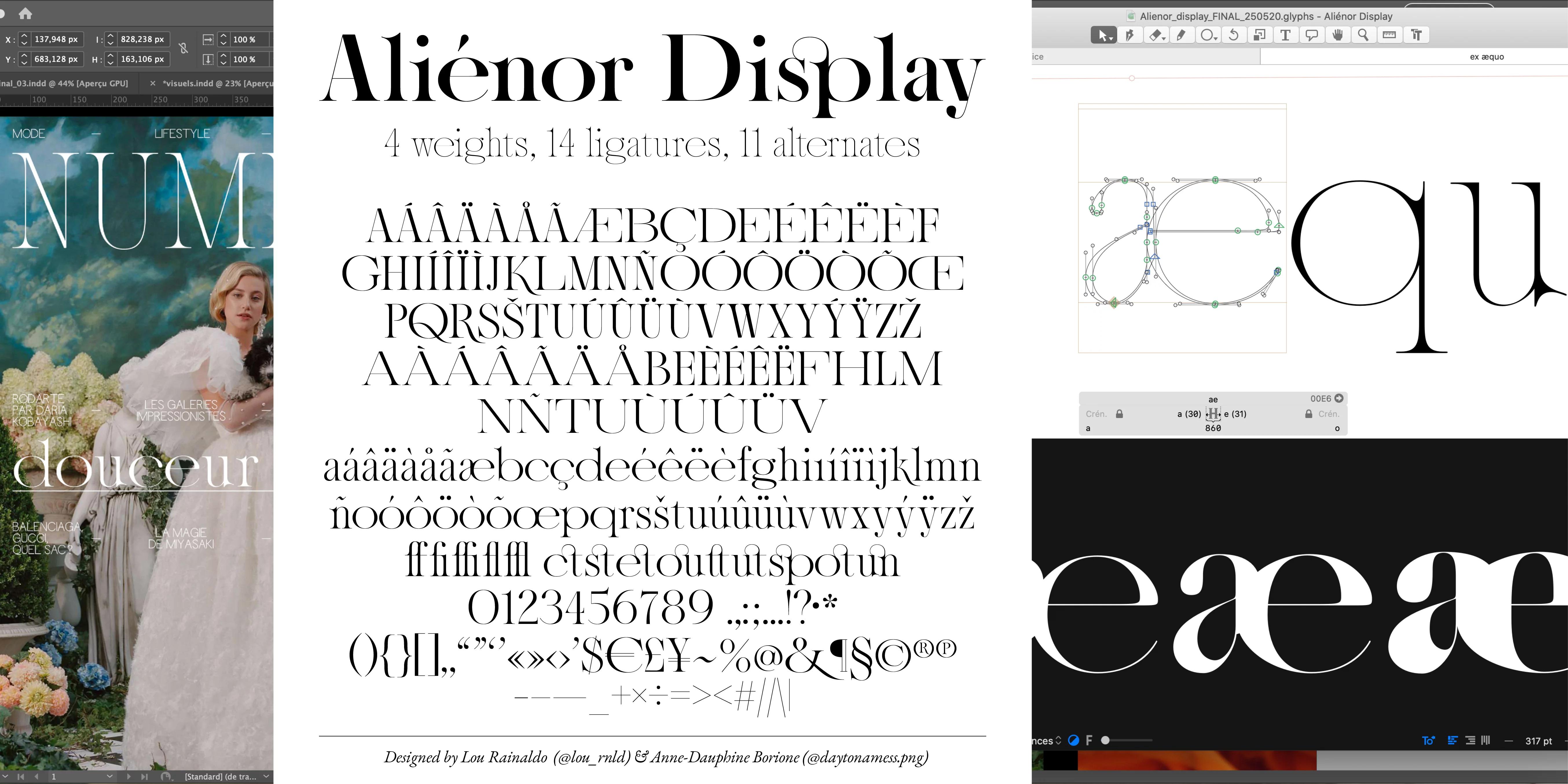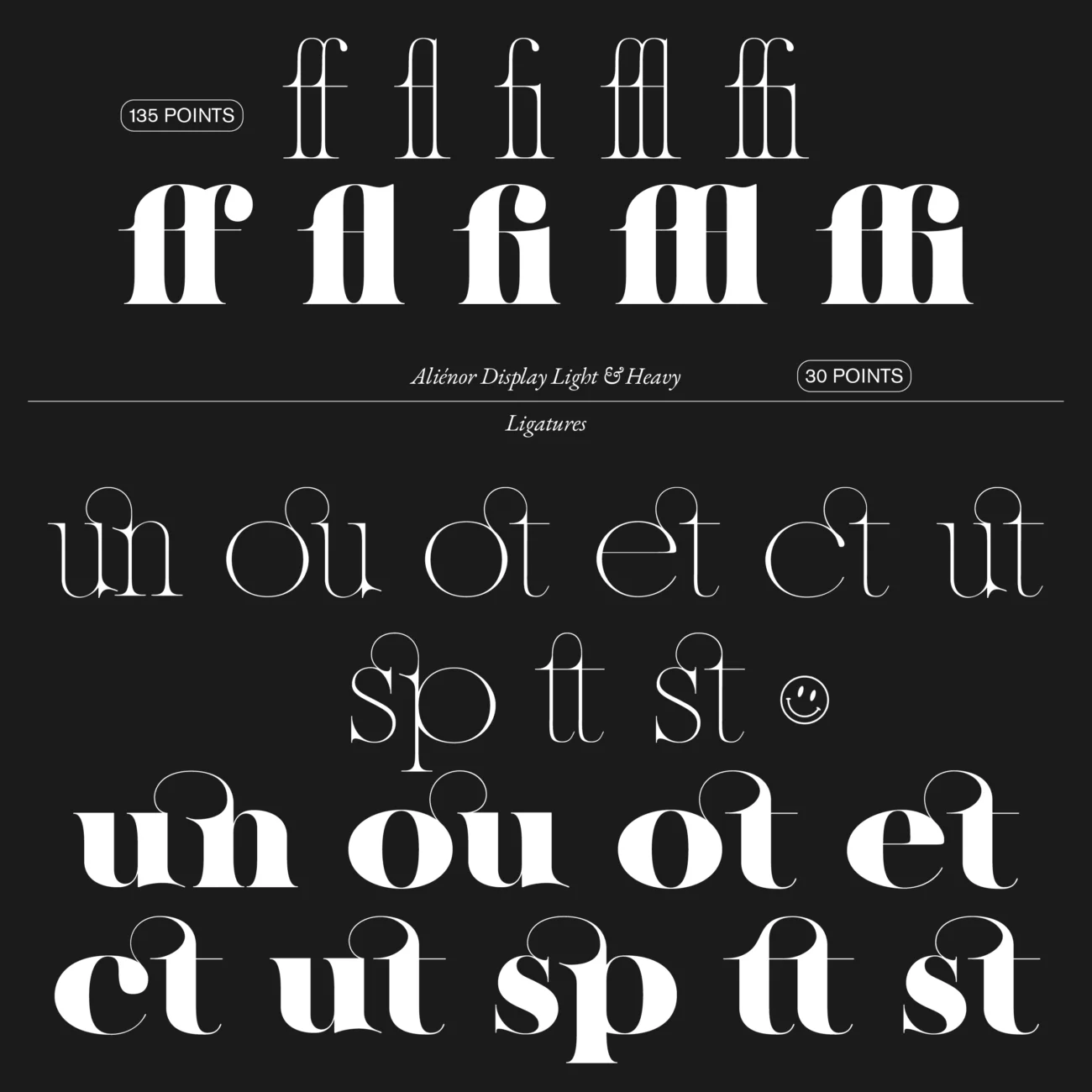 Created with the intention of conveying ‘elegance in its purest form,’ it is undeniable that Lou and Anne have delivered with their vision for Aliénor. Firstly, it is filled with unique flourishes. One of our favourites is the connections between stems and serifs, which have their own unique, characterful curvature and taught feeling of extension. Tying together these curvatures, details and contrasting widths are fixed upstrokes; which add a sense of refined uniformity to the typeface’s flowing nature.