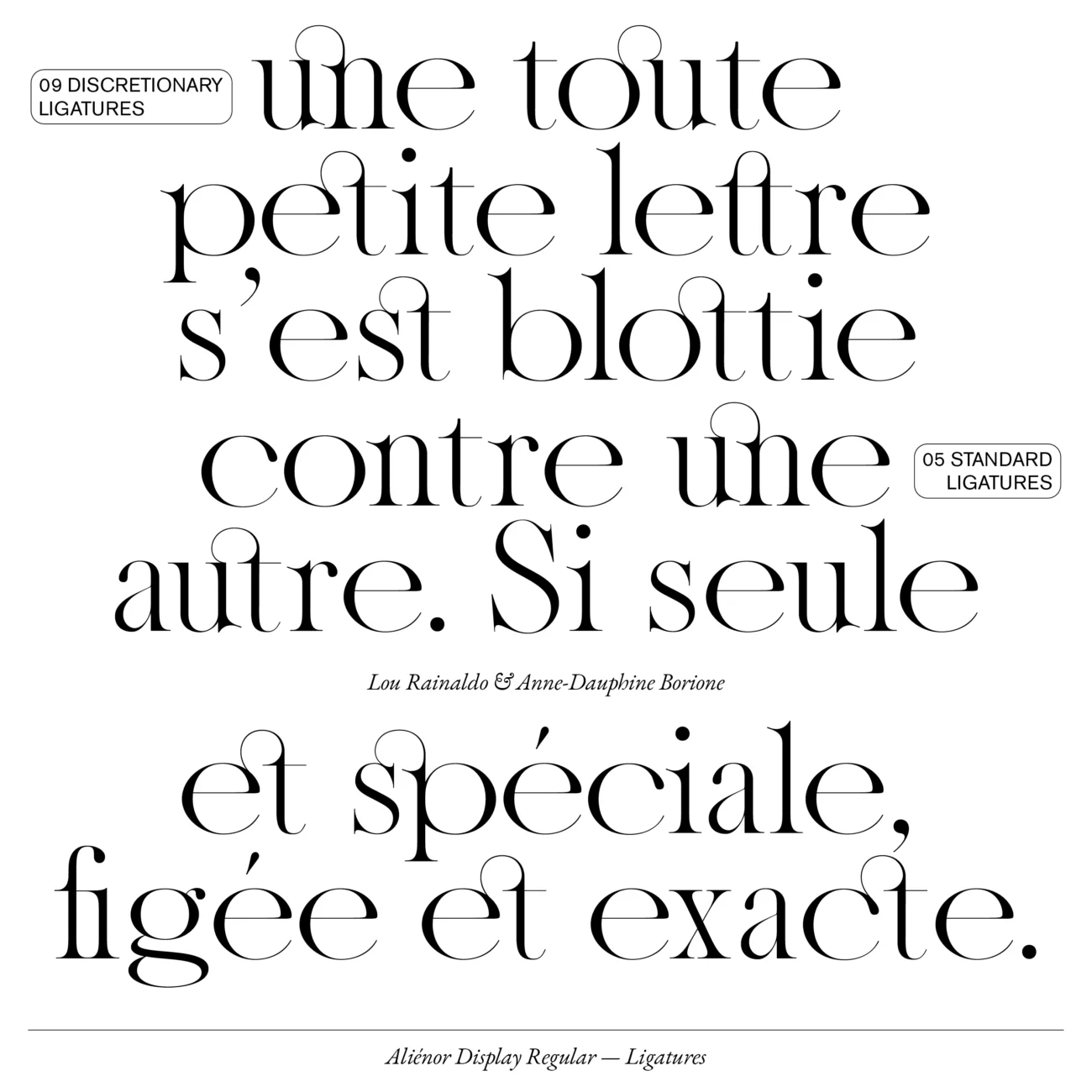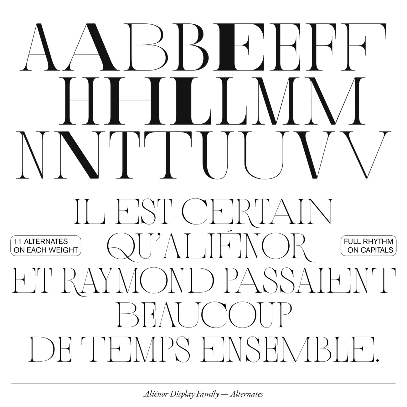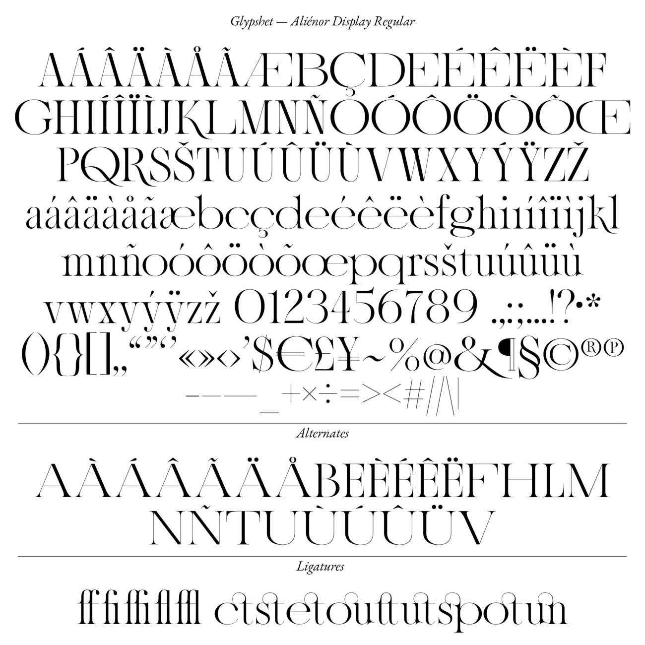 The typeface also offers a variety of alternative glyphs, so that text composed from capitals alone can emulate the same elegance and harmony as the lowercase characters. Its many additional ligatures also provide the opportunity for further versatility, as well as the ability to alternate between wide and narrow widths on eleven letters. The overall aesthetic of Aliénor almost feels akin to sheet music, and its carefully devised contrasts and consistencies mean that its individual character can shine through whilst being accessible, calm and easy on the eyes.