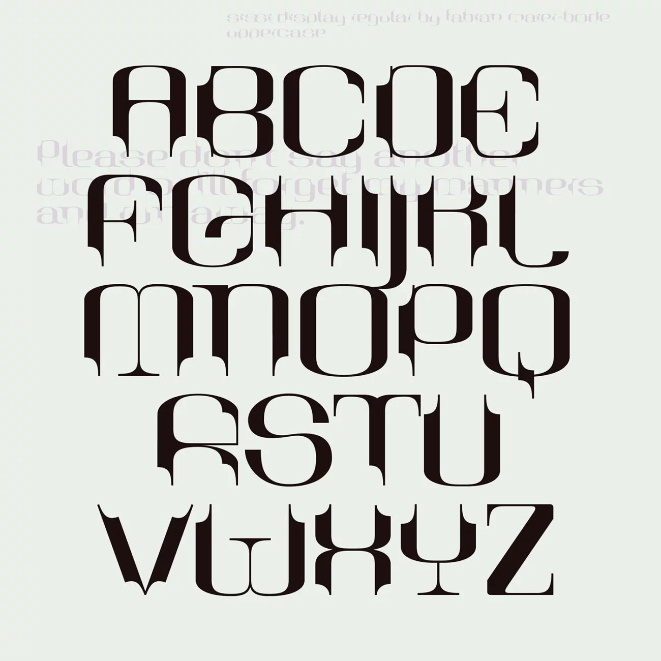 The inspiration for this stunning typeface was pulled from a film of the same name; Sissi, made in 1955 with Romy Schneider. Inspired by the furniture and dresses in the film, the typeface is built from initial sketches which grew from playing around with modular shapes which reflected those of the costume and set design in the ’50’s film.