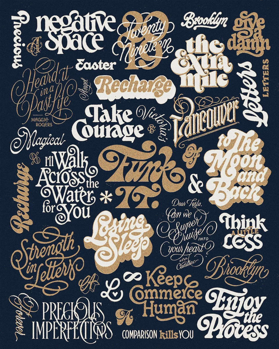 M: When I first started out, as cliché as it may sound, I used to get inspired by the lettering work I was seeing online, and wanting to put my own spin on it. I also use a variety of books about type and lettering, ever since I moved to the big city, though, I learned that you can get your inspiration literally anywhere and from anything, the trick is to just keep your eyes open and look around. Type is everywhere, and cities are a goldmine for it. Neon signs at corner shops, posters on the side of the road, old book stores or record stores, train station signs… you name it! It’s become a habit now, whenever I walk around town, to actively look for interesting type treatments and details. I simply take a picture of them so I can use them as references or inspiration for my own work.