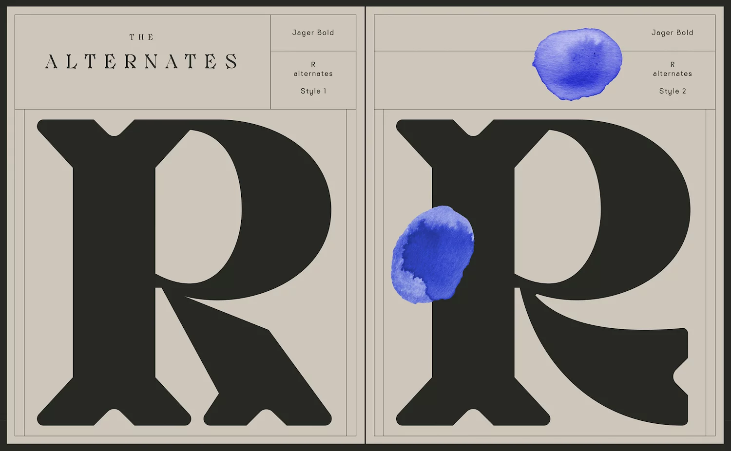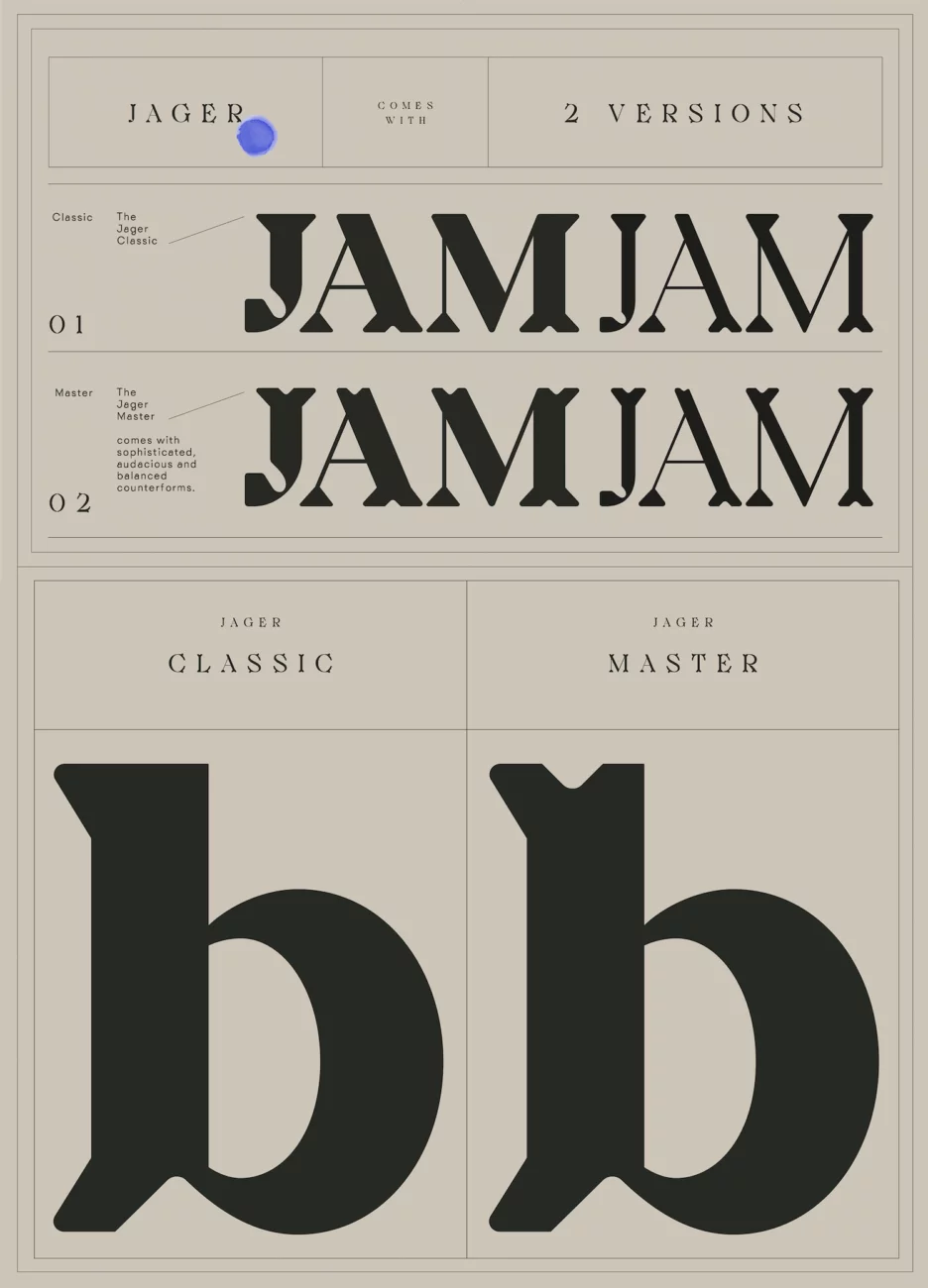 The close attention to the angles within the glyphs and the soft, rounded contours give Jäger the impression of having been carved into wood, whilst the hollowing out of the counter-forms harkens back to the shapes made in engravings and sculptures, or even the physical flow of chisel-work. These shapes are intended to reflect the skills and practices of fine craftsmanship and in this way, the typeface is just so impressive. It is visually iterative and articulate – not only in the visual references it makes shape-wise, but in the flow of the text and the interaction between glyphs; which feels full of movement and the history and feel of the physical motions of fine craftsmanship practices.