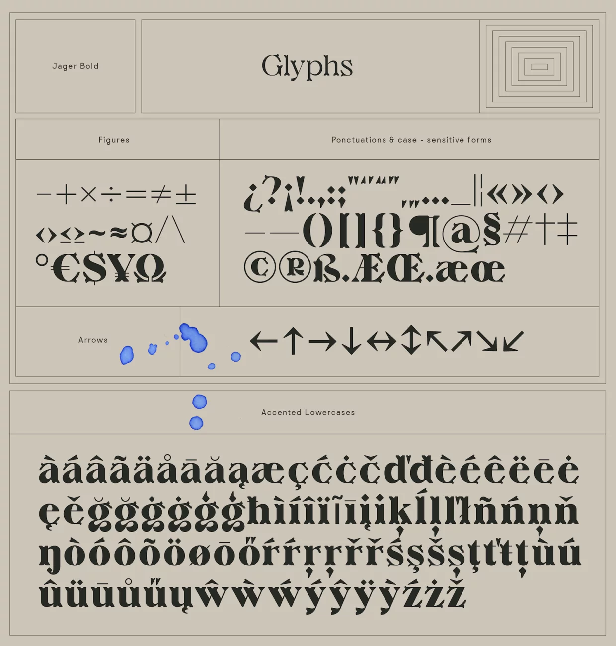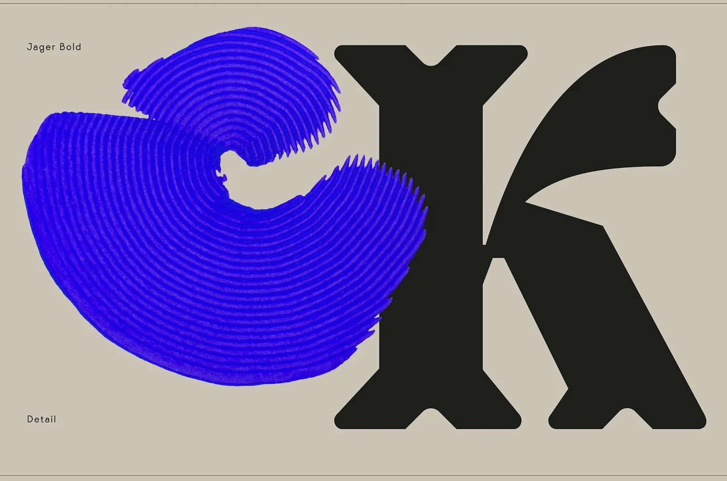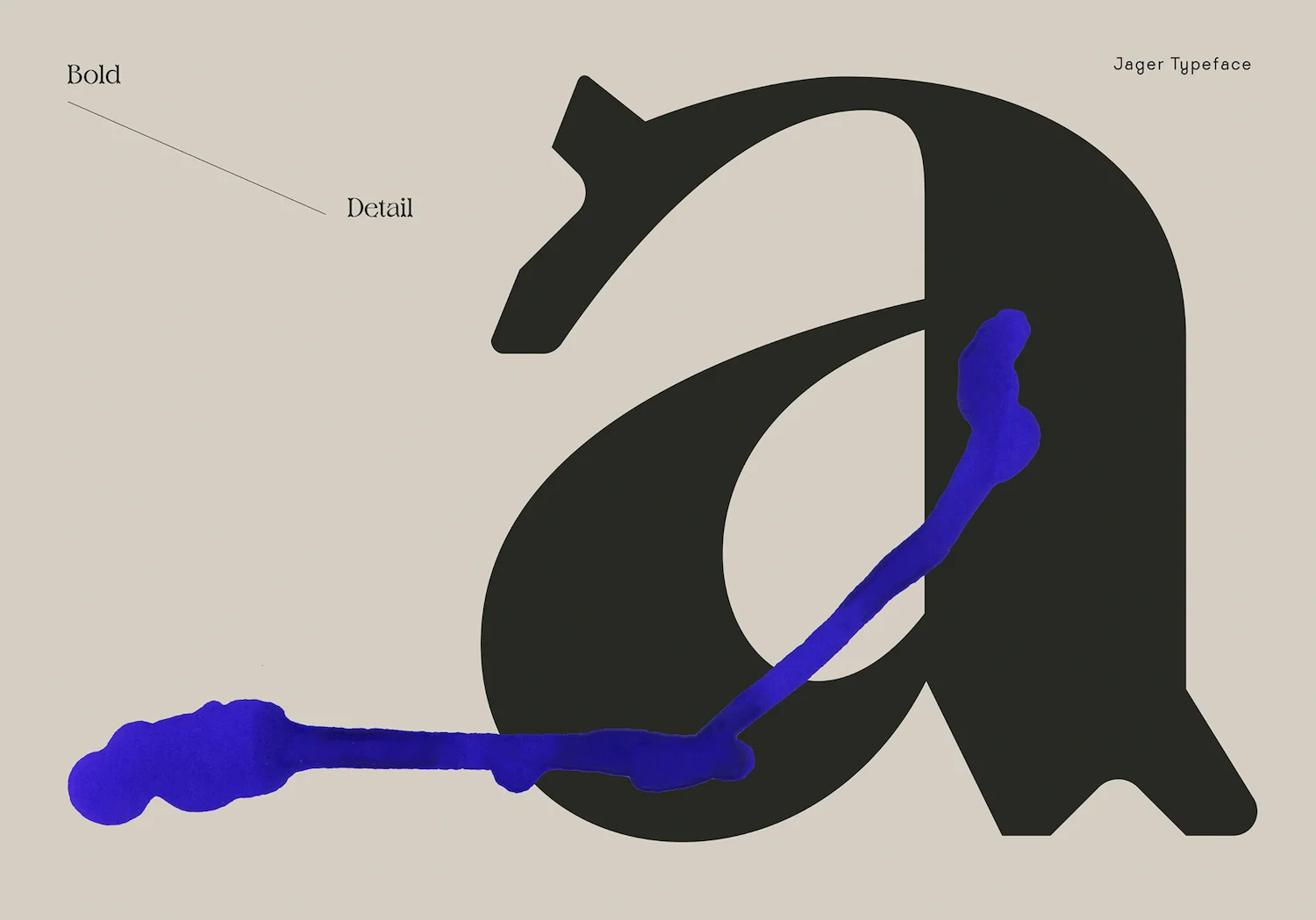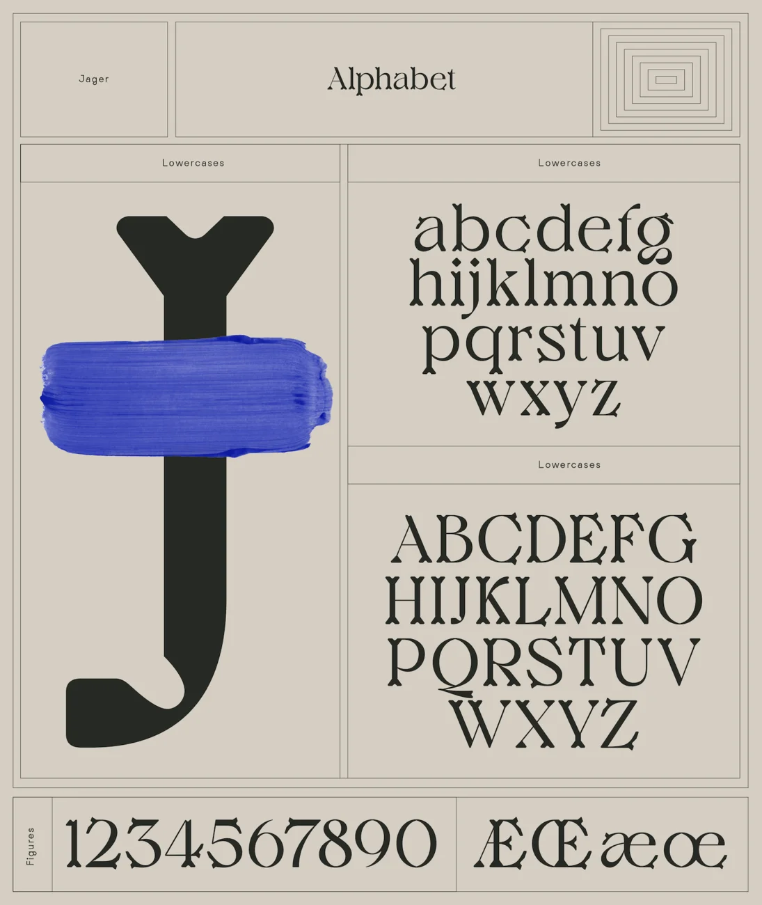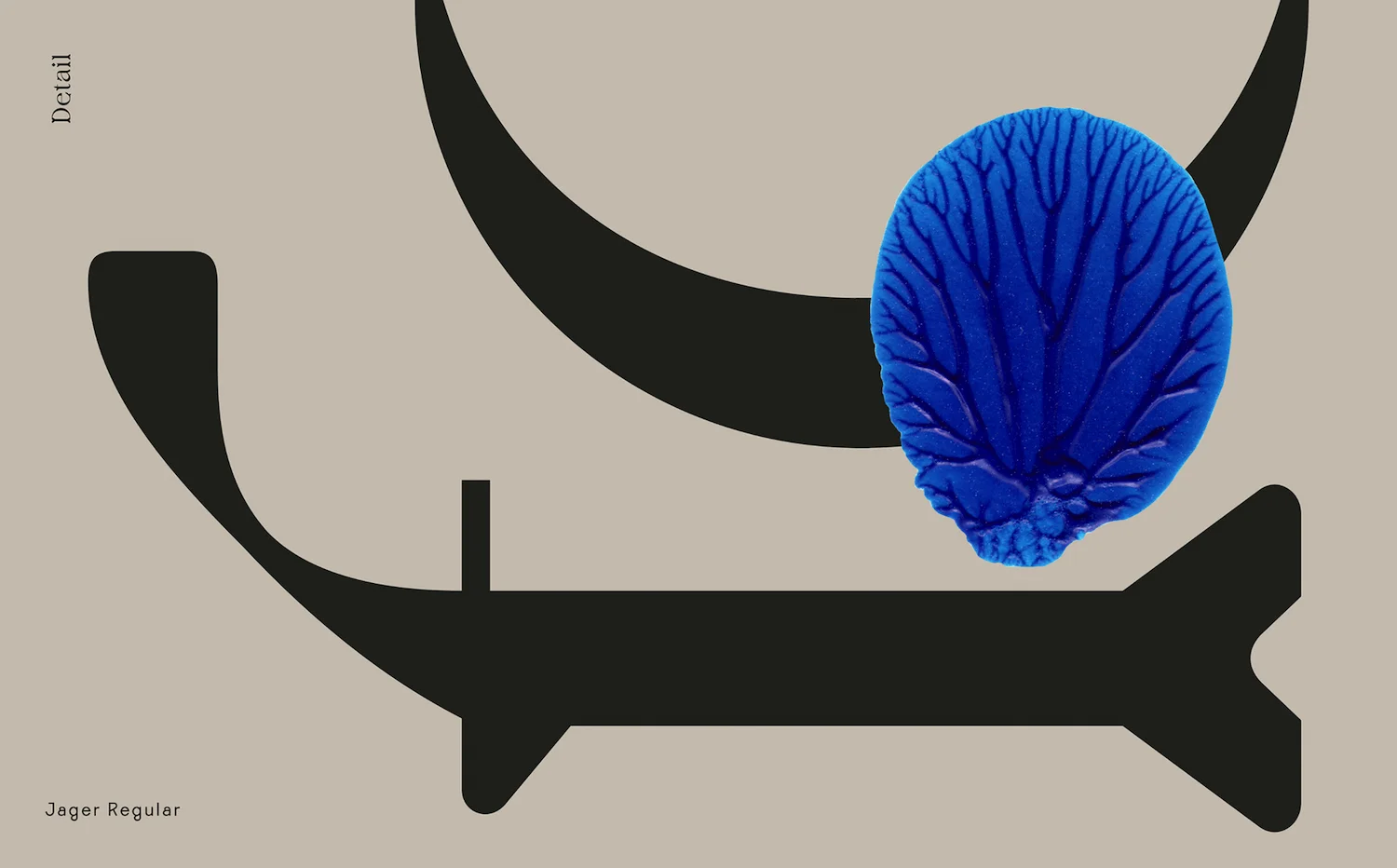 Certainly, the feel of the characters is incredibly tactile and gentle, but the overall effect and the interaction between the glyphs feels sharp, engaging and fresh. Its decorativiaty is super interesting, as the typeface is actually built from relatively simple-looking shapes; however, the impeccable compositional judgement and productive use of counter-space renders Jäger juxtapositional of ornate detail and contemporary simplicity.