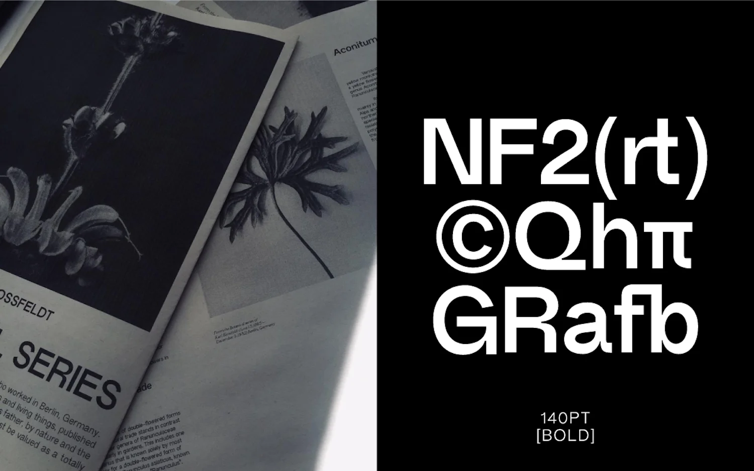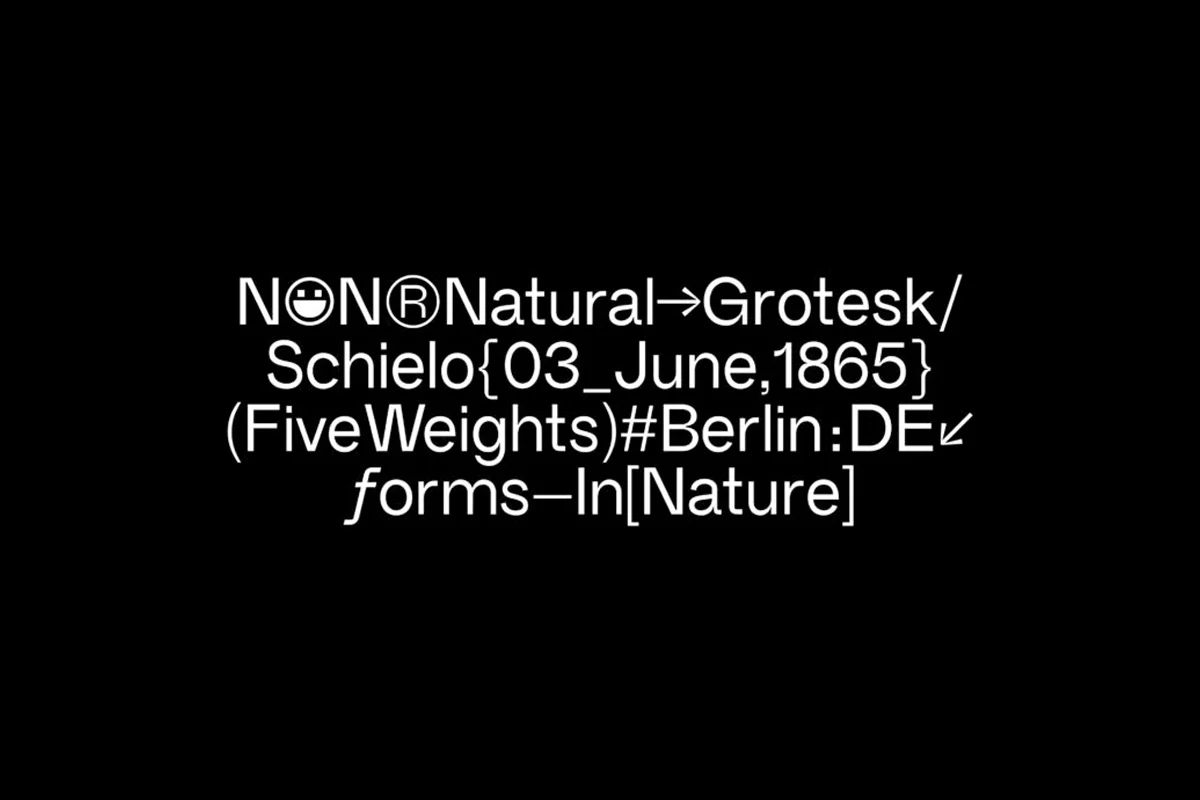 Meeting functionality with subtle, purposeful quirks, Non Natural Grotesk first presents as straightforward and kind of utilitarian… But, what’s so compelling about the typeface is that it only takes a millisecond and you’re drawn in to its fascinating details and its deviations from conformity. In Non’s words, ‘The geometric shapes and structure reflect the inspiration and influences of mid century Swiss Typography. Non Natural moves among the vast historical material that shaped modern typography, combining contemporary details with classic styles.’