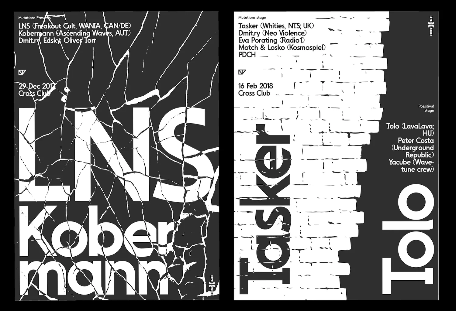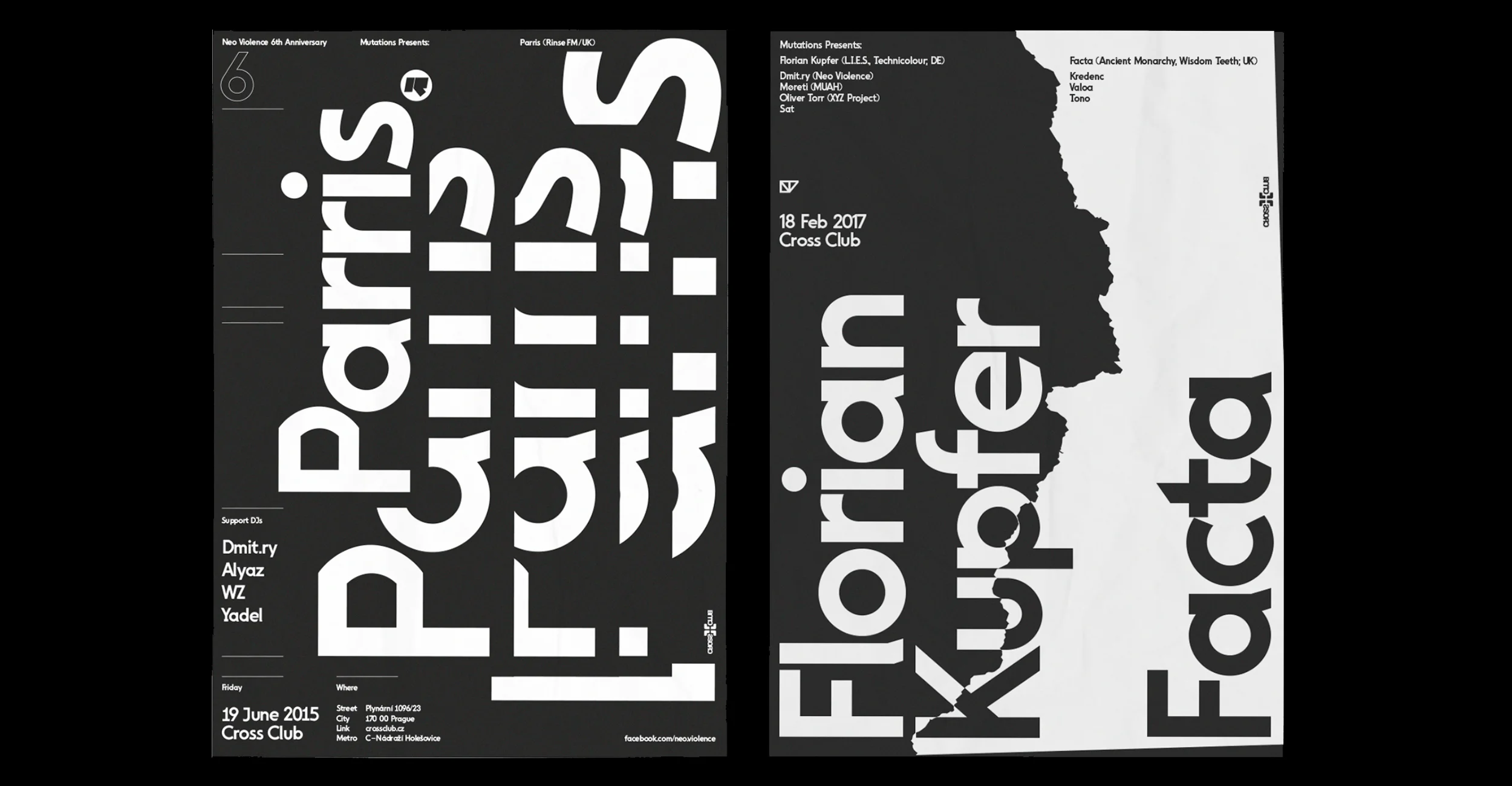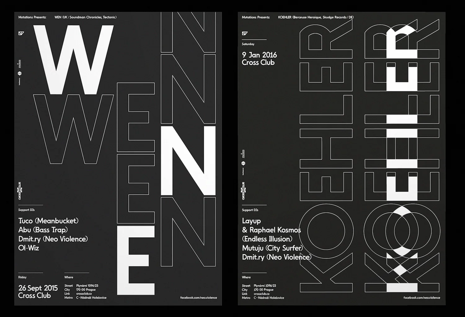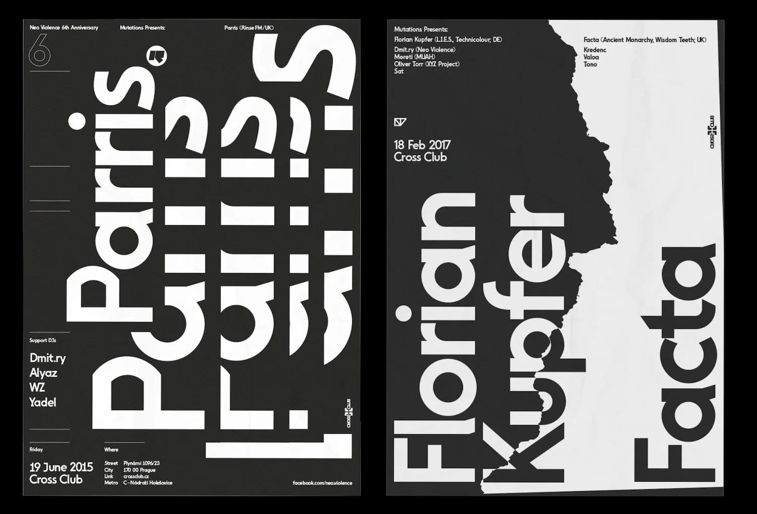 We also think that their typographic work is worth highlighting; particularly their posters for Neo Violence & Beef Records. The series Mutations was created to promote gigs in Cross Club, Prague (presented by Violence & Beef Records). The posters are monochrome and extremely textural, featuring type which is spliced and layered over on itself; showcasing Displaay’s eye for meeting minimal functionality with a unique visuality and intriguing tone.