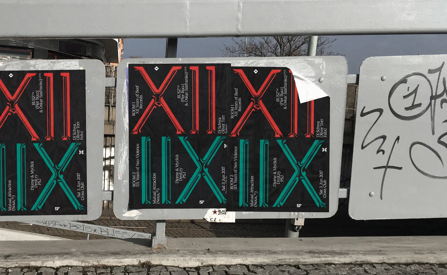 The limited colour palette of the black, green and red typographic Neo Violence & Beef Records posters melds stunningly with the glossy, seemingly malleable-yet-metallic roman numeral type work; which sits in stunning contrast with the concrete of Prague.